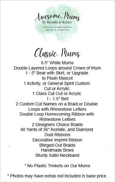 Ordering online is easy. Build your custom mum by making choices from the order column. When finished, place your item in your online cart, make your payment, or continue shopping. You can also put multiple mums or garters in your cart. If you have questions about extra items or packages look at our BRAIDS/ADD-ONS drop-down menu on our website, or call us. We're happy to answer questions.