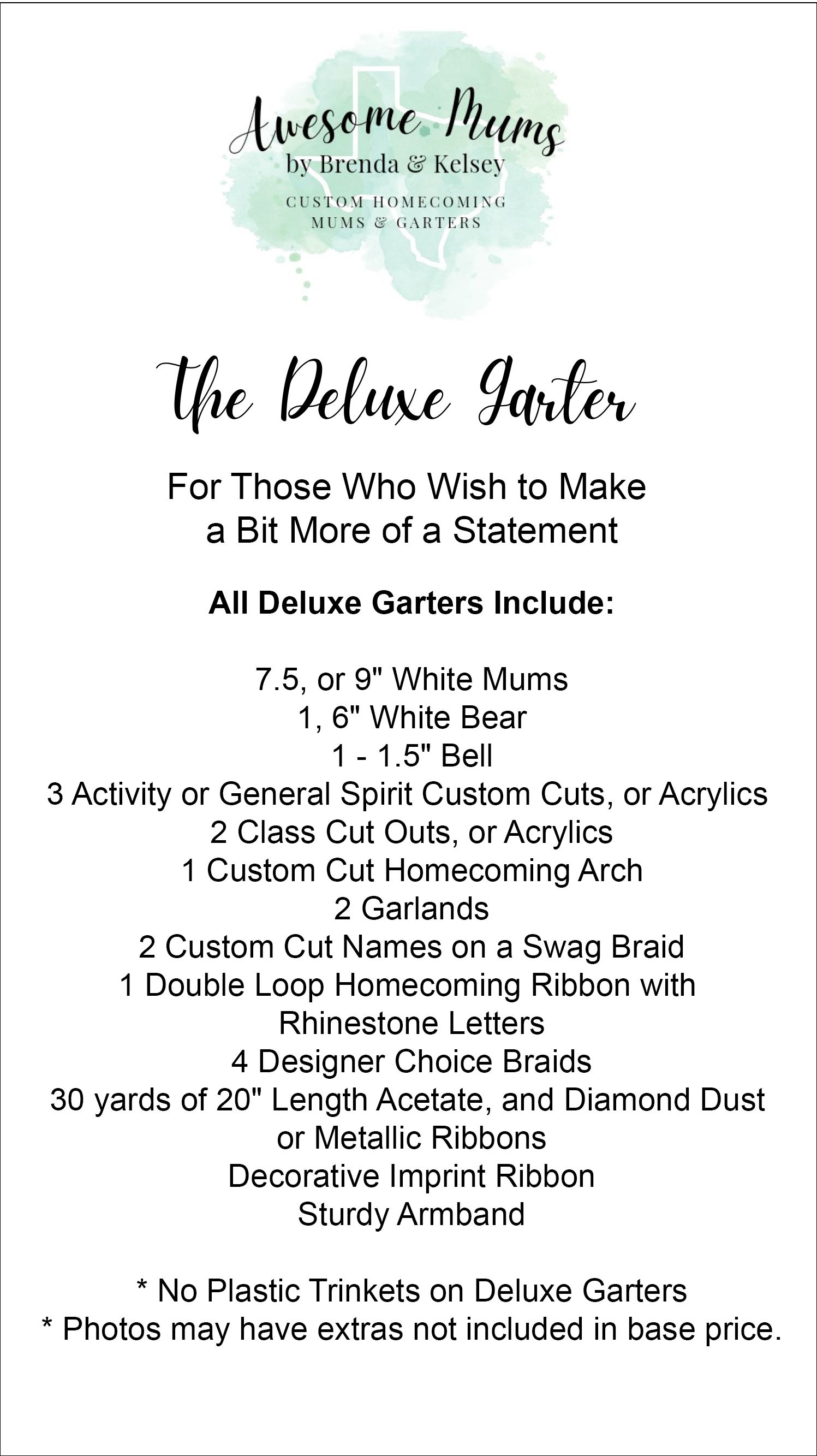 Ordering online is easy. Build your custom garter by making choices from the order column. When finished, place your item in your online cart, make your payment, or continue shopping. You can also put multiple mums or garters in your cart. If you have questions about extra items or packages look at our BRAIDS/ADD-ONS drop-down menu on our website, or call us. We're happy to answer questions.