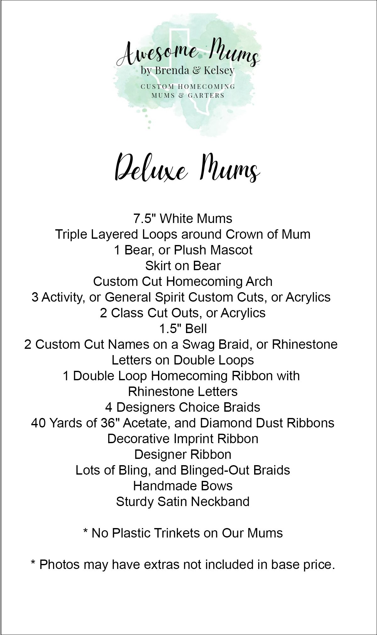 Ordering online is easy. Build your custom mum by making choices from the order column. When finished, place your item in your online cart, make your payment, or continue shopping. You can also put multiple mums or garters in your cart. If you have questions about extra items or packages look at our BRAIDS/ADD-ONS drop-down menu on our website, or call us. We're happy to answer questions.